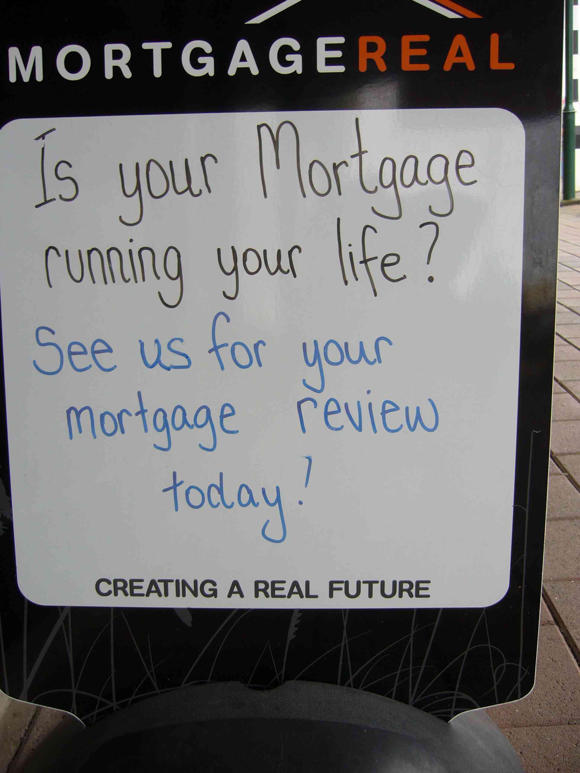In front of the local Mortgage Office you can read today (15.07.08), “IS YOUR MORTGAGE RUNNING YOUR LIFE? — SEE US FOR YOUR MORTGAGE REVIEW TODAY! — CREATING * A REAL FUTURE.”