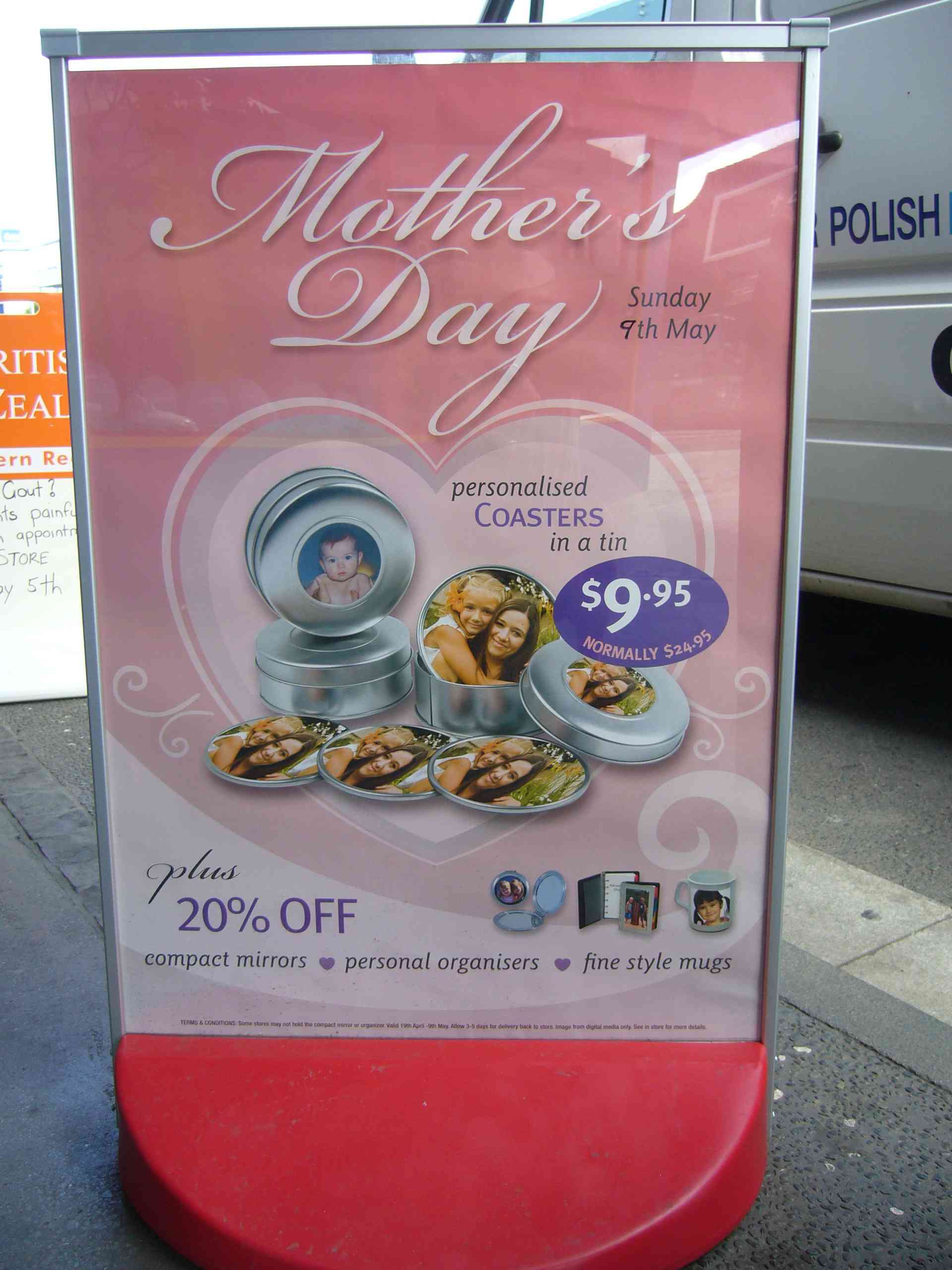 Farmers is another big shop here in Kaitaia. The Farmers catalogue at the present time is very big and has many pages. The front cover has a beautiful picture, a mother and a little girl. Both have beautiful white teeth. Underneath the picture you can read, “A beautiful Mother’s Day starts with a gift from Farmers.”